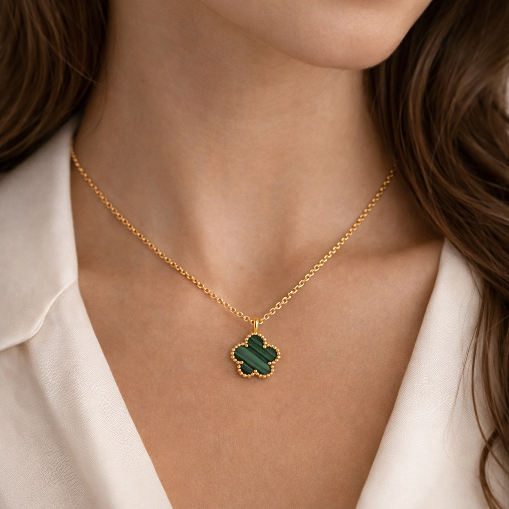 Луксозен дамски гердан с елегантна висулка във форма на детелина в наситено изумрудено зелено, обрамчена с фини златни детайли. Моделът излъчва класа, стил и женственост, превръщайки се в изискан акцент към всяка визия – от ежедневна до официална.