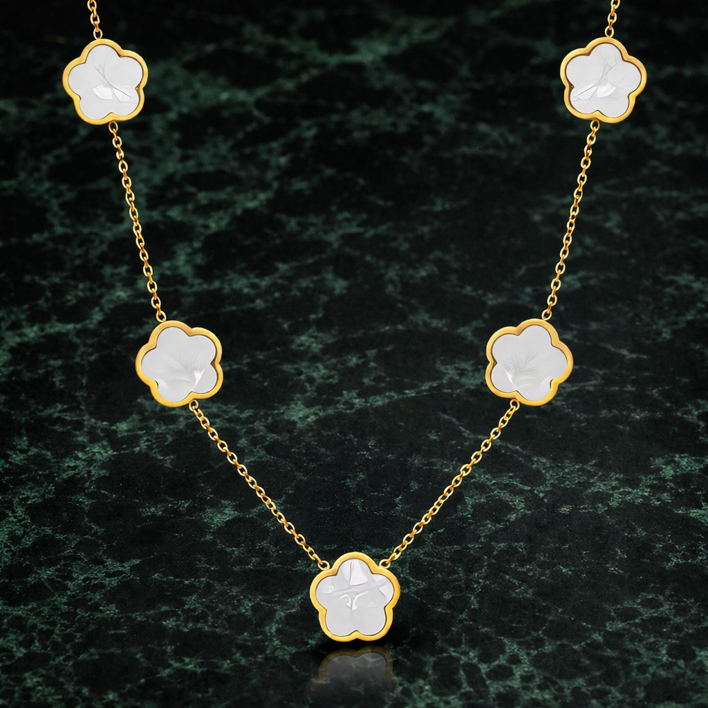 Луксозен дамски гердан с елегантни висулки във форма на детелина в изискан перлено бял цвят, обрамчени с фини златни детайли. Моделът съчетава нежност, класа и женственост, превръщайки се в стилно бижу, което придава изтънченост на всяка визия – от ежедневна до официална.