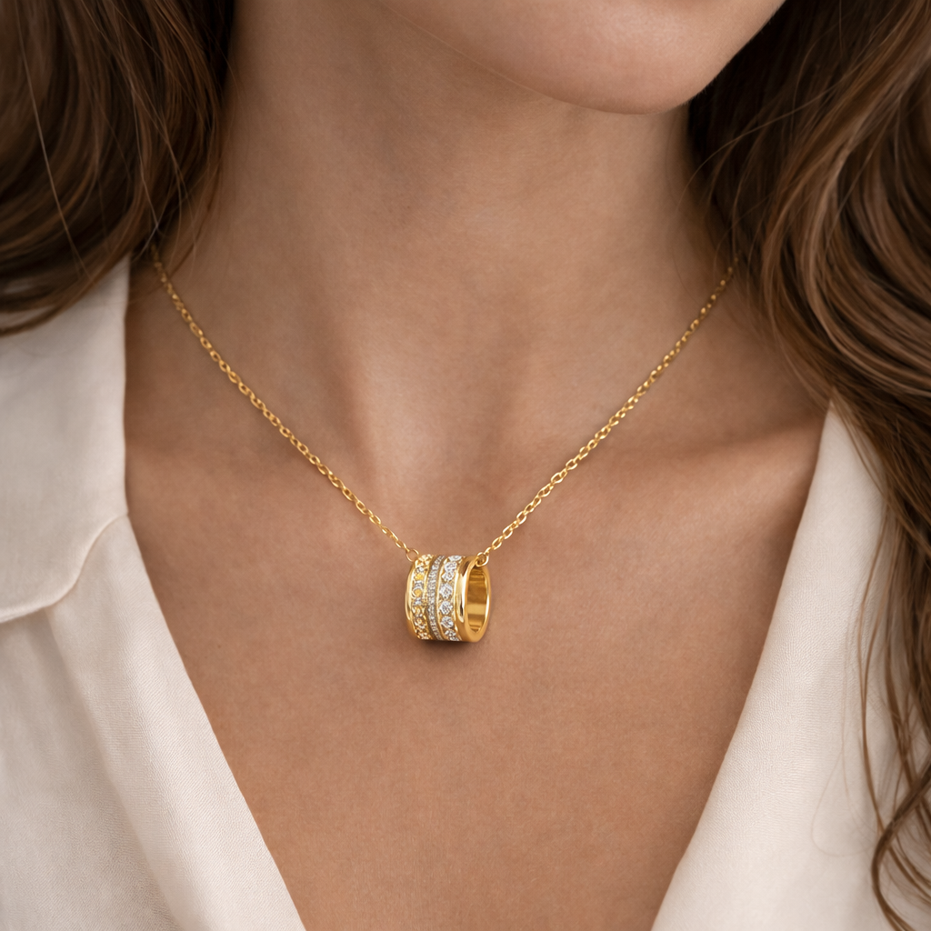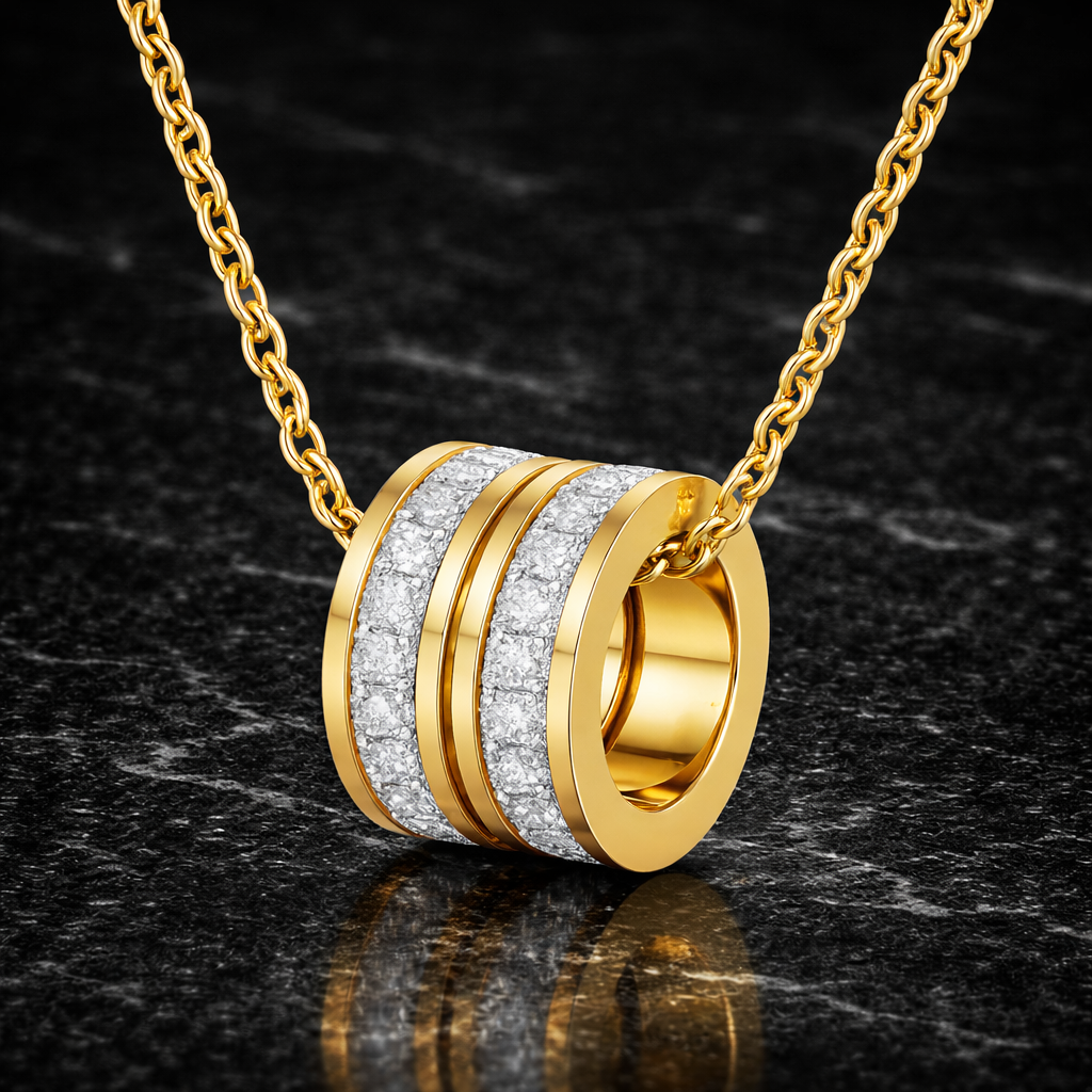 Луксозен дамски гердан с модерна цилиндрична висулка, украсена с редове блестящи камъни, които придават изискан блясък и стил. Дизайнът съчетава минимализъм и елегантност, превръщайки бижуто в стилен акцент към всяка визия – от ежедневна до официална.