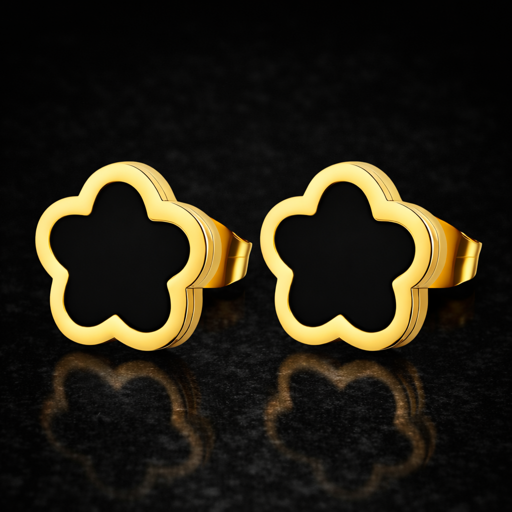 Луксозни дамски обеци с елегантен дизайн във форма на цвете и стилен черен акцент, който придава изтънчен и модерен характер. Минималистичната форма и златистият контур създават изискано бижу, което допълва перфектно както ежедневни, така и по-елегантни визии.