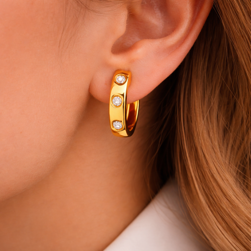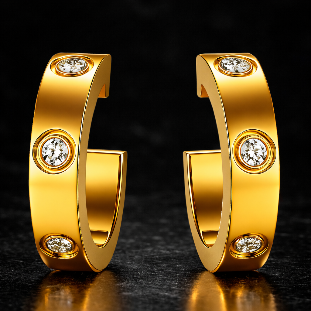Луксозни дамски обеци с модерен и изчистен дизайн, украсени с фино инкрустирани блестящи камъни. Елегантната форма на халка в комбинация със сияйните детайли създава стилно и изискано бижу, което добавя блясък и характер към всяка визия – както ежедневна, така и официална.